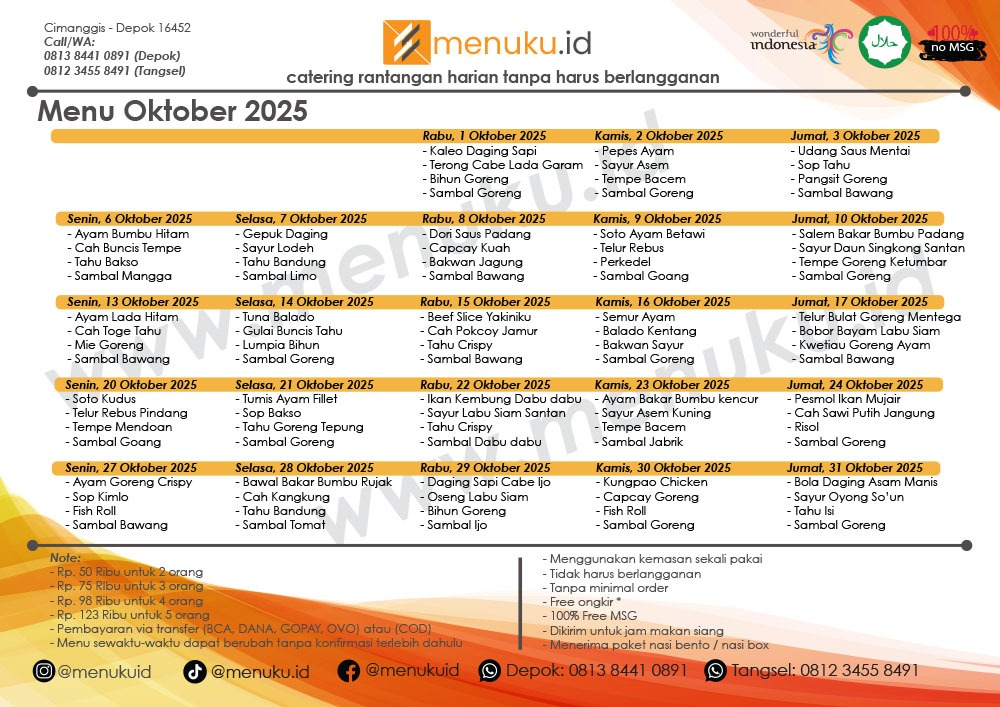 TUTUPMenuku.id menyajikan catering rantangan harian dengan puluhan macam menu pilihan yang selalu berganti setiap harinya Kami merupakan solusi untuk kamu yang sibuk, males masak atau bingung siapin lauk untuk orang tersayang dirumah Tinggal pilih deh sesuai kebutuhanmu, mw paket rantangan untuk berapa orang... Kamu pasti selalu ingin membuat orang tercinta di rumah ngerasain makan enak tiap hari kan... ;) Dengan pengalaman dalam melayani ratusan porsi setiap harinya, kami siap melayani kamu dengan sepenuh hati, makanan di antar sampai depan pintu rumah Gak harus berlangganan loh... dan gratis ongkir ;) - catering depok; catering rumahan; catering rumahan depok; catering didepok; catering harian depok